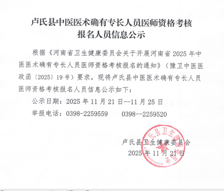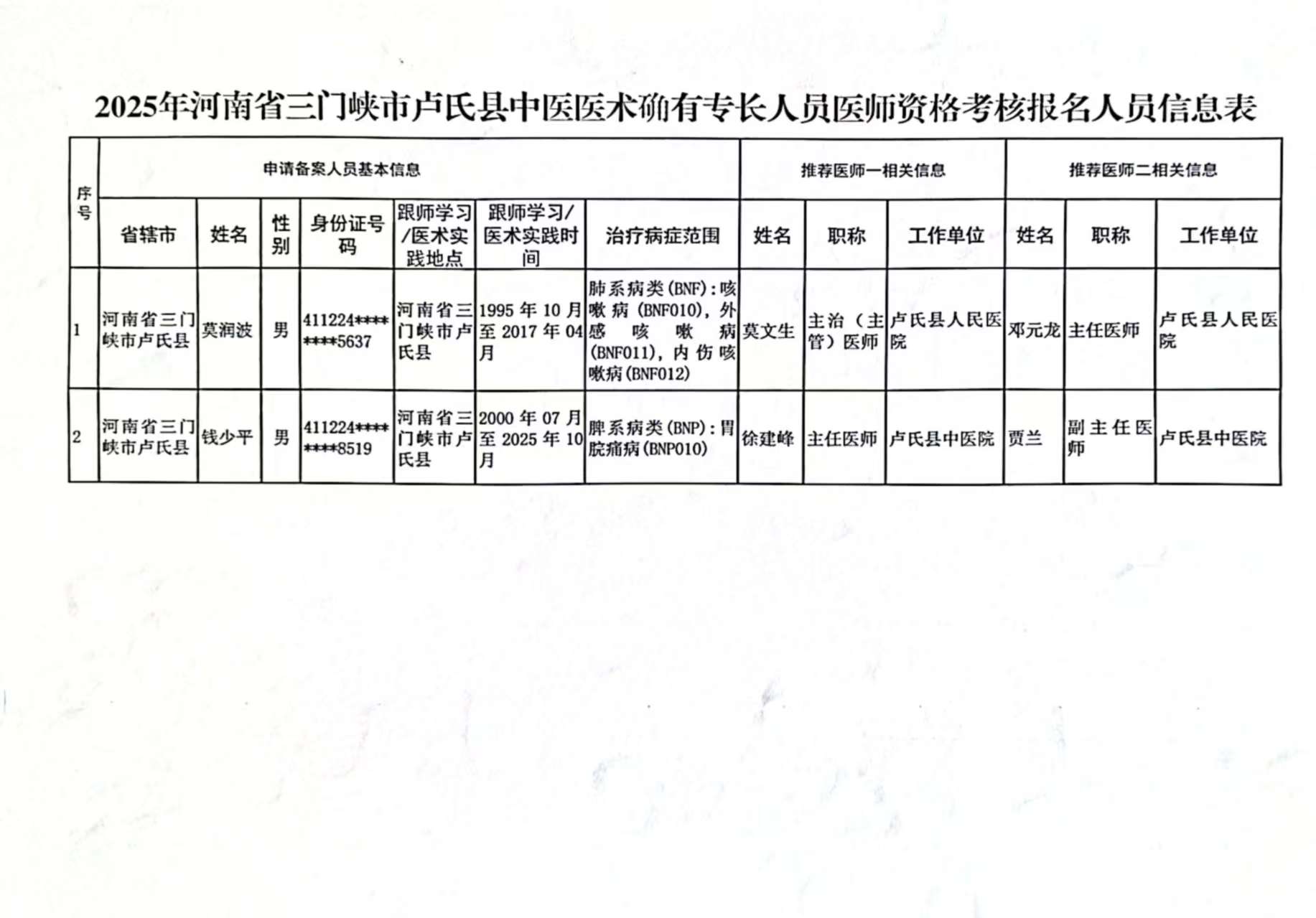 卢氏县中医医术确有专长人员医师资格考核报名人员信息公示