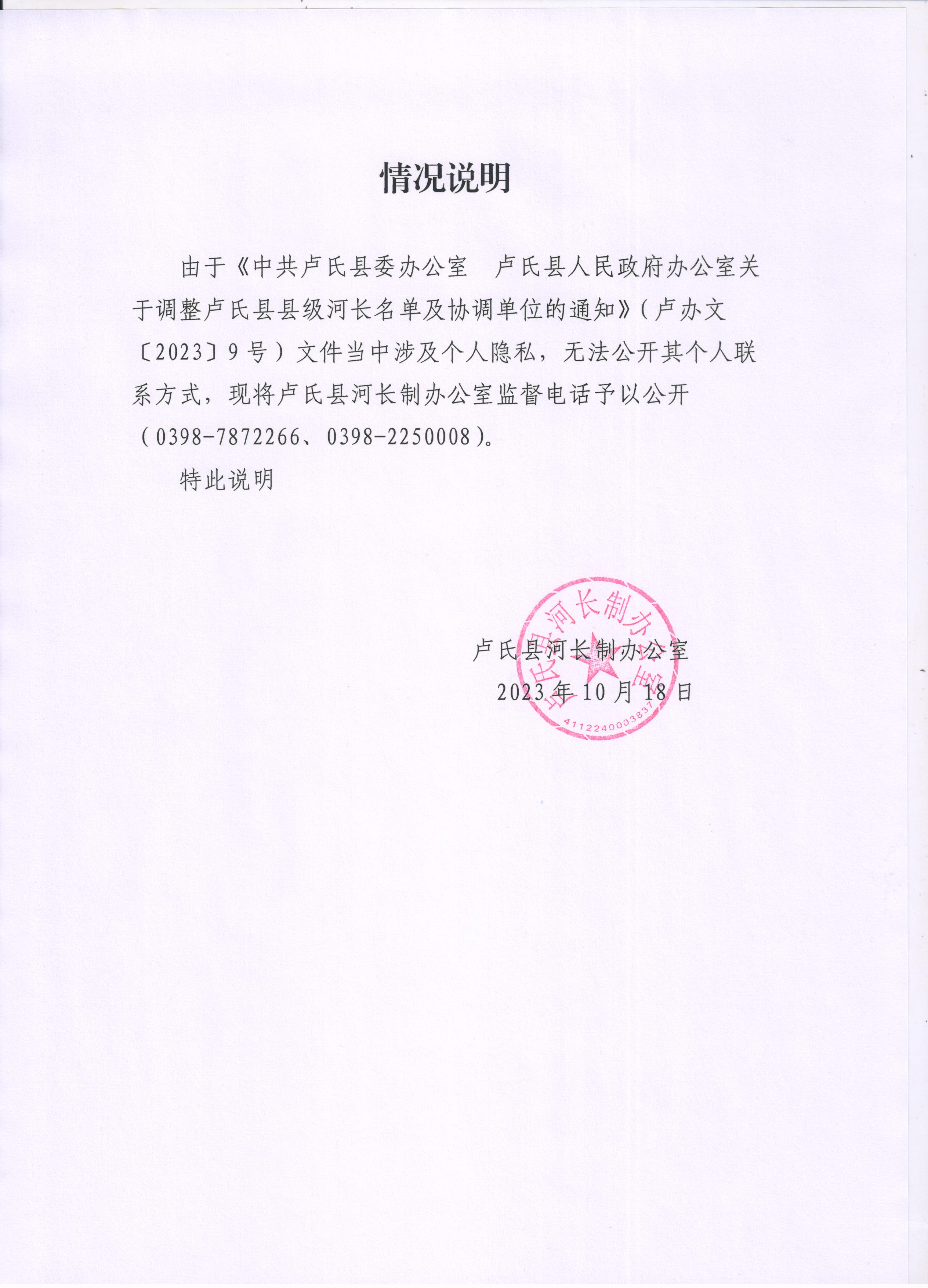 关于河长制监督电话公布的情况说明