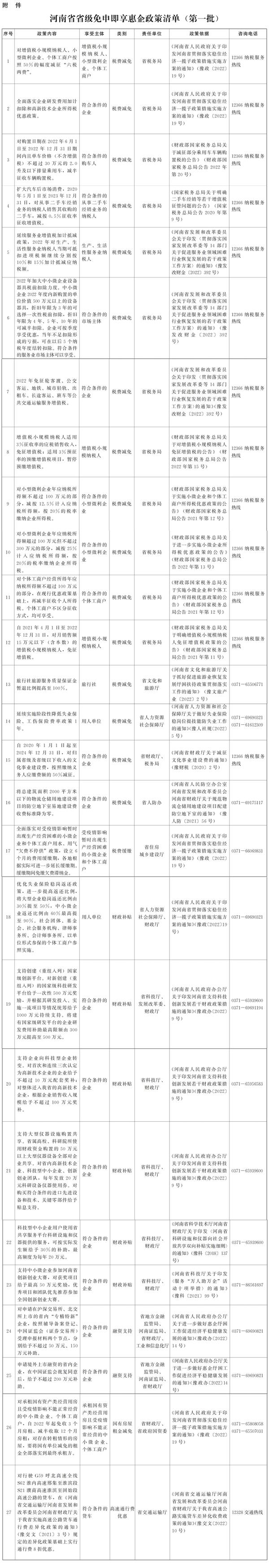 《河南省省级免申即享惠企政策清单(第一批)》共包含27条惠企政策,其中涉及税费减免17项,财政补贴6项,融资支持2项,国有房屋租金减免1项,高速通行费优惠1项。
