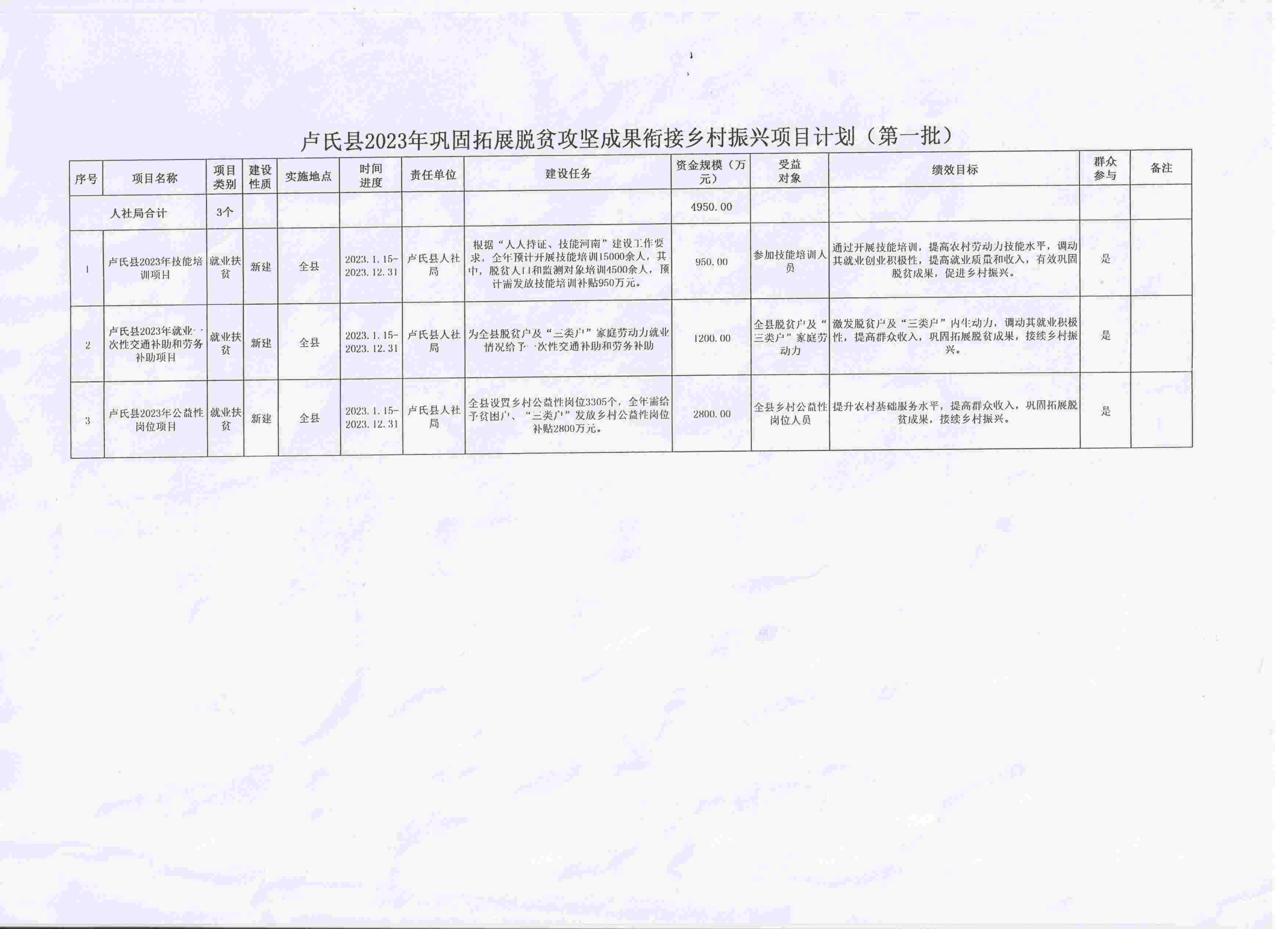 根据卢氏县巩固拓展脱贫攻坚成果有效衔接乡村振兴工作领导小组《关于下达2023年巩固拓展脱贫攻坚成果衔接乡村振兴项目计划(第一批) 的通知》(卢巩固脱贫组〔2023〕1号),批复在我局实施的就业一次性交通补助、公益性岗位和技能培训3个项目,现给予公示。